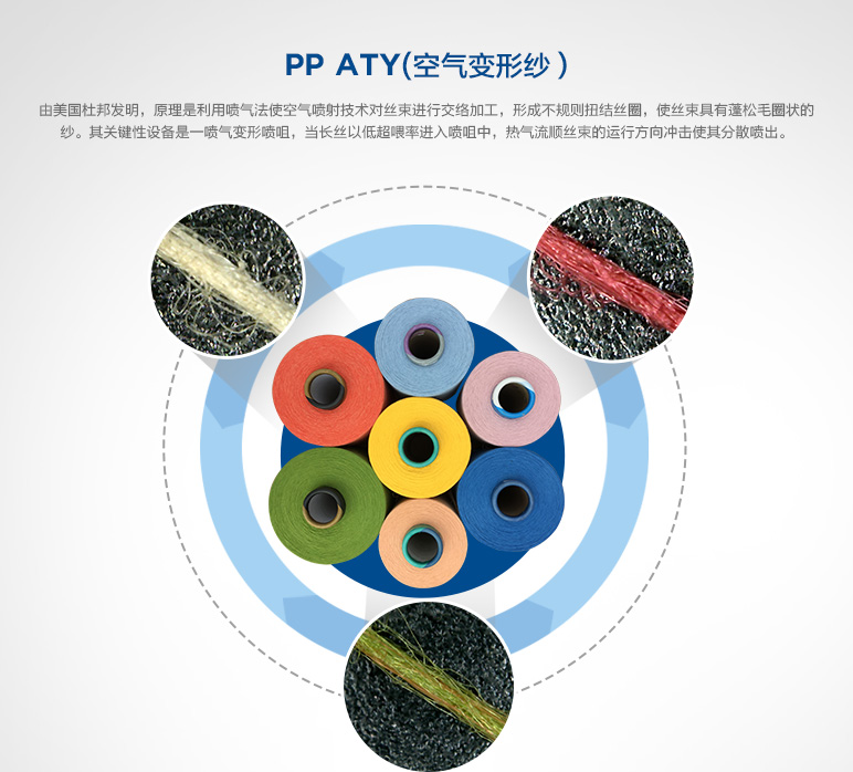 PP空氣變形紗(丙綸ATY)特點:具有色澤豔麗、環保、質輕、耐化學性、熱傳導性低、抗菌防臭、強度高、耐腐蝕、不黴蛀、保暖性好、芯吸性強、吸汗導濕、手感柔軟等優點。