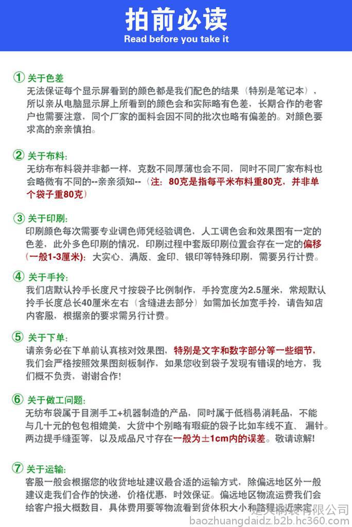 【規格尺寸】可根據客戶需要定製 【產品顏色】有多種花色的布料可供選擇,還可以為用 戶定製專版圖案或顏色的布料。 【布料規格】布料厚度80g/90g/100g/ 可供選擇。 【最小訂量】1000pcs 【交貨周期】確認打樣後10天內交貨 【印刷工藝】可為客戶印刷LOGO,印刷工藝為絲網印、 熱轉印 【產品用途】作為企業的資料袋或產品包裝袋 【廣告效果】可做為購物袋反複使用/宣傳