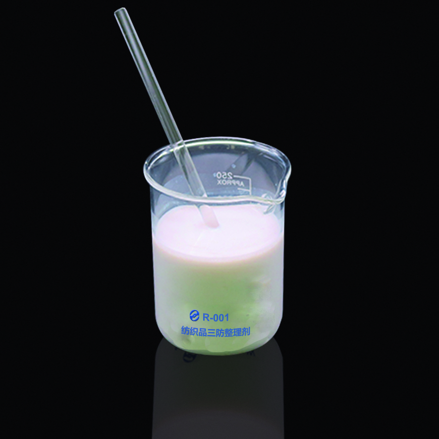 【產品名稱】紡織品三防整理劑 【產品代號】R-001 【外觀】乳白色液體 【有效成分】氟共聚物 【離子性】弱陽離子 【pH(2%工作液)】6.0±0.5 【比重】1.03
