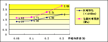圖2:纖維對混凝土抗衝擊強度的影響 實驗條件:按國標GB/T15231.5-94的規定進行 混凝土的配合比: 水泥:砂=1:2,水灰比=0.38 試件尺寸為:120×50×10mm×6塊,齡期為28天