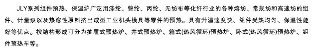JLY係統組件預熱、保溫爐廣泛用於滌綸、錦綸、丙綸等化纖行業的各種熔紡、常規和高速紡的組件、計量泵以及熱熔性原料擠出成型工業機頭模具等零件的預熱。