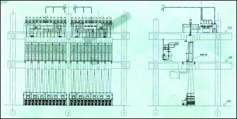●采用下裝式杯形組件噴絲板或橢圓形噴絲板以及新型大位距1250―1500mm節能紡絲箱和有高效靜態混合器的熔體分配管道。
