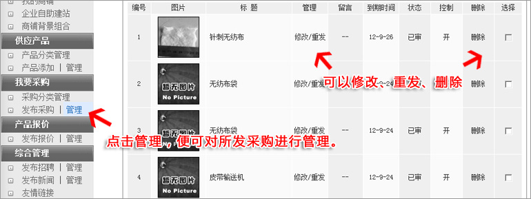 點擊"我要采購"下麵的"管理",便可以對以往采購進行修改、重發、刪除。