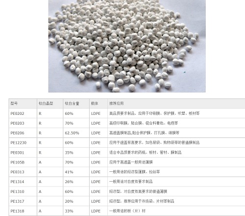 白bai色se母mu是shi以yi優you質zhi進jin口kou金jin紅hong石shi型xing鈦tai白bai粉fen為wei主zhu要yao原yuan料liao,經jing與yu載zai體ti樹shu脂zhi和he分fen散san劑ji,潤run滑hua劑ji等deng多duo種zhong助zhu劑ji混hun合he,並bing經jing高gao性xing能neng雙shuang螺luo杆gan擠ji出chu機ji充chong分fen混hun煉lian,擠ji出chu造zao粒li而er成cheng,具ju有you在zai基ji體ti樹shu脂zhi中zhong分fen散san性xing好hao,白度高,加工性能好等優點.此款白色母鈦白粉含量在15%左右,具有耐曬,抗老化的特點,適合用於抽粒,注塑等生產工藝。