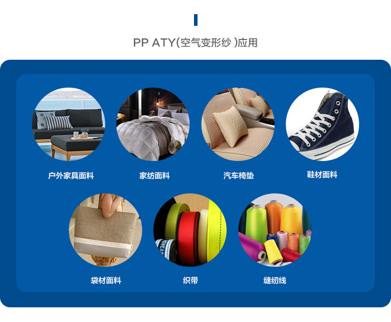 PP空氣變形紗(丙綸ATY)用途:戶外家具麵料、家紡麵料、汽車椅墊、鞋材麵料、袋材麵料、織帶、縫紉線。