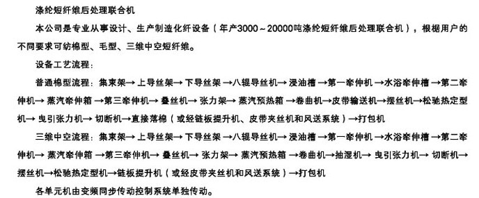 本公司是專業從事設計、生產製造化纖設備(年產3000~2000噸滌綸短纖維後處理聯合機),根據用戶的不同要求可紡棉型、毛型、三維中空短纖維。