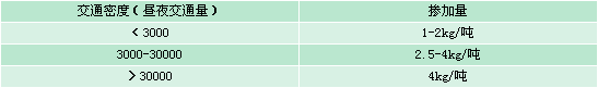 根據交通流量的大小,建議TB-Fiber纖維的摻加量(以每噸瀝青混合料為基準)