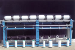 DTJ倒筒機 倒筒機用於小筒子的DTY絲並成大筒子,最大卷裝可達5kg。 本機選用FK6型機器的卷繞係統,以確保卷繞的筒子有良好的成形及退繞。由於槽筒帶變頻幹擾更加確保75d以下加彈絲的退繞。(粗彈絲不帶變頻) 導絲部份配有漲力器可調節適當漲力,確保筒子的成形漲力。 本機黑輥(Φ100)550M/min~750M/min,750M適用75d以下細彈絲。