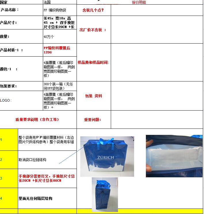 采購:40萬個PP編織袋   采購量:400000個   產品描述:40萬個PP編織袋,詳細資料在表格上,單邊雙手腕,一長一短,袋口拉鏈取消,改成敞口的,可以做的供應商請旺旺聯係報價    y