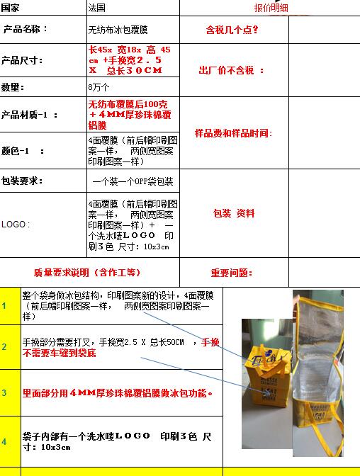 采購:8萬個無紡布冰包   采購量:80000個  產品描述:8萬個無紡布覆膜冰包,腹膜後100克無紡布+4mm珍珠棉覆鋁膜,袋子前後幅一個logo,兩側邊印刷另一個logo,詳細資料在表格上,可以做的供應商請旺旺聯係報價    y