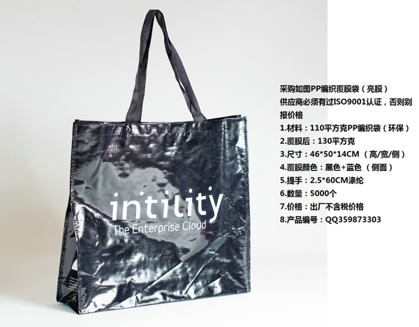 廣東 東莞 聯係人:李朝清 聯係電話: 采購:PP編織覆膜袋 采購量:5000個 產品描述:采購如圖要求PP編織覆膜袋。需要ISO認證工廠,否則勿擾~